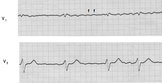 Рис. 28. Мерехтіння передсердь, нормосистолічна форма. Частота шлуночкових скорочень - від 78 до 100 за 1 хвилину, в середньому - близько 80 уд./хв.; хвилі f.