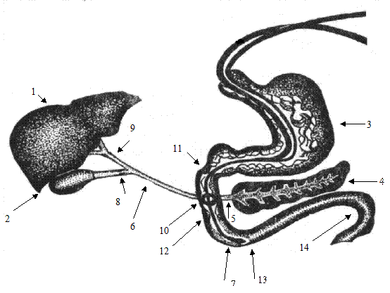 Рис. Розташування органів травної системи і гастродуоденального зонда: 1- печінка, 2 - жовчний міхур, 3 - шлунок, 4 - підшлункова залоза, 5 - головна протока підшлункової залози, 6 - загальна жовчна протока, 7 - олива дуоденального зонда, 8 - замикач Люткенса-Мартинова, 9 - замикач Міріцці, 10 - замикач Одді, 11 - бульбо-дуоденальний замикач, 12 - медіо-дуоденальний замикач Капанджі, 13 - дистальний замикач дванадцятипалої кишки Окснера, 14 - Трейцева зв’язка.