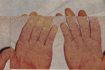 Рис. Симптом " мертвих пальців" при синдромі Рейно (адаптовано за Р.Хеггліним, 1965). Характерні для системної склеродермії також остеоліз дистальних фаланг і епіфізарний остеопороз, внаслідок якого у крові зростає вміст кальцію. Останній відкладається у тканинах під шкірою, особливо пальців китиць, і тканинах довкола суглобів – синдром Тіб’єржа-Вейсенбаха. Ураження м’язів зазвичай є у вигляді фіброзного інтерстиціального міозиту з розростанням сполучної тканини і атрофією власне м’язових волокон або ж у вигляді істинного міозиту з первинними дегенеративними і некротичними змінами у м’язових волокнах і наступним склерозом. Перша форма ураження м’язів зустрічається частіше, друга – рідше. З вісцеритів для системної склеродермії найбільш характерним є ураження серця, що спостерігається майже у всіх таких хворих. Внаслідок склеродермічного кардіосклерозу розвиваються задишка, тахікардія, порушення ритму. Серцева недостатність розвивається поступово і невпинно прогресує. Ураження перикарда проявляється склерозуванням і фіброзом епікарда з накопиченням рідини у перикардіальній порожнині. При цьому може вислуховуватись шум тертя перикарда. Тони серця зазвичай ослаблені. На ЕКГ – конкордантна елевація сегмента ST в поєднанні із зниженням біоелектричної активності серця. Сукупність змін з боку міокарда (кардіосклероз), ендокарда (мітральна вада серця) та перикарда (перикардит) отримала назву “склеродермічне серце”. З боку легень зазвичай розвивається пневмофіброз, фіброзуючий альвеоліт. Фіброз легень може бути дифузним або ж з утворенням кист. Окрім пневмосклерозу з дисемінованим, помірним або обмеженим фіброзом, швидко розвиваються емфізема легень, бронхоектази, адгезивний плеврит. Базальний дифузний фіброзуючий альвеоліт Хамана-Річа часом може бути єдиною ознакою системної склеродермії. Перебігає склеродермічний пневмосклероз зазвичай доброякісно і рідко ускладнюється хронічним декомпенсованим легеневим серцем. У частини хворих розвивається інтерстиційна пневмонія або ж гнійний бронхіт. Рентгенологічно знаходять з обох боків посилення та деформацію легеневого малюнка. Рідше на фоні “склеродермічних легень” може розвиватись альвеолярний рак легень, пневмоторакс, кистозні зміни. Плеврит при системній склеродермії так само спостерігається рідко і зазвичай є обмеженим адгезивним процесом. Шлунково-кишковий тракт втягується у патологічний процес у 2/3 хворих, причому зміни торкаються всього травного каналу – від ротової порожнини до прямої кишки, однак найбільш частими є зміни з боку стравоходу і кишечника. Порушення рухової функції стравоходу поєднується із шлунково-стравохідним рефлюксом та ацидопептичним езофагітом. Клінічно це проявляється дисфагією, зригуванням, печією, відчуттям стороннього тіла у стравоході. Ураження кишечника характеризується дуоденітом, ентеритом, синдромами малдигестії та малабсорбції. Часом виникають паралітичний (динамічний) ілеїт, поятрення, ішемічні некрози кишечника, кровотечі тощо. Зазвичай у таких хворих знижується кислототвірна функція шлунка, проте ахілія розвивається рідко. З боку печінки зміни можуть бути різними – від фіброзу до жирової дистрофії і стеатозу печінки. Рідше розвивається гепатолієнальний синдром з портальною гіпертензією. Зазвичай 
