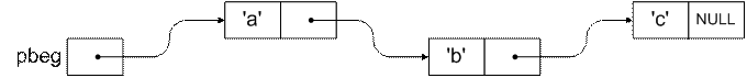 При этом в программе выражение pbeg означает указатель на первое звено в цепочке; * pbeg означает само первое звено, (* pbeg). info — первый элемент списка. По-другому первыйэлемент обозначается с помощью операции доступа к члену структуры через указатель: pbeg − > info. Выражение pbeg − > next означает указатель на второе звено. Далее, *pbeg− > next — само второе звено, pbeg− > next− > info — второй элемент списка, pbeg− > next− > next — указатель на третье звено, *pbeg–> next− > next — само третье звено, pbeg− > next− > next− > info — третий элемент списка, pbeg− > next− > next− > next — пустой указатель (конец списка). Заметим, что соседние звенья цепочки располагаются в оперативной памяти произвольно относительно друг друга, в отличие от соседних компонент массива, всегда занимающих смежные участки памяти. Такое расположение звеньев облегчает операции вставки и удаления, так как нет необходимости перемещать элементы, как это было бы в случае реализации списков массивами.