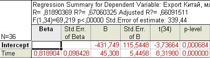 Таблица 6. Результаты расчета параметров линейной модели тренда для динамического ряда объема экспорта Китая за период с 1977 по 2012 гг.