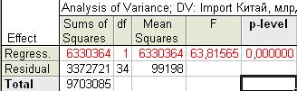 Таблица 7. Результаты дисперсионного анализа линейной модели тренда для динамического ряда объема экспорта Китая за период с 1977 по 2012 гг.