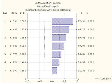 Рис 5. Графическое изображение анализа автокорреляции динамического ряда объема импорта Китая за период с 1977 по 2012 гг. Вывод: