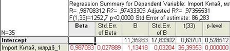 Далее рассчитываем численные значения коэффициентов уравнения авторегрессии. При этом в качестве зависимой переменной выбирается исходный ряд, в качестве независимой – ряд, сдвинутый на лаг назад, так как нас интересует зависимость текущего уровня от предыдущего. Результаты расчетов следующие: Таблица 23. Результаты расчета параметров авторегрессионной модели для динамического ряда объема экспорта Китая за период с 1977 по 2012гг.