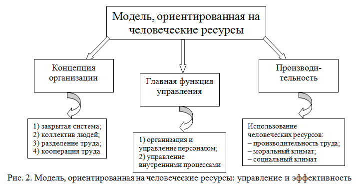 Основная тенденция повышения производительности − снижение издержек. Отметим, что механическая модель предприятия критически оценивается современной наукой и практикой из-за ее стремления к сохранению стабильности (консерватизм), всеобщего контроля за качеством и выполнением плановых заданий, представления о высших руководителях, которые «мудрее, чем рынок». Модель, ориентированная на человеческие ресурсы − это коллектив людей, использующих принципы разделения и кооперации труда. К этому типу относились системы научного управления трудовыми коллективами, работающими на социалистических предприятиях. Особое внимание уделялось стилю управления, его влиянию на повышение производительности труда и удовлетворенность работников своим трудом, вовлечение их в процесс разработки управленческих решений (рис. 2).