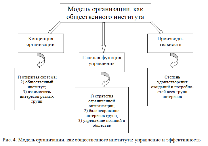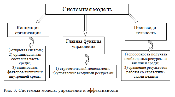 Системная модель представлена в виде сложной иерархической системы, тесно контактирующей с внешней средой (рис. 3). Главная идея заключается в признании всех элементов системы и системы в целом с внешней средой. Отметим, что эффективность данной модели сомнительна, в связи с тем, что она формировалась под наблюдением государства и эффективность определялась, в основном, внутренней средой организации.