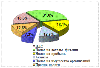 Удельный вес поступлений федерального бюджета в общем объеме поступлений в консолидированный бюджет Российской Федерации в 2013 году составил 25, 2% и относительно уровня 2012 года снизился на 2, 7 процентного пункта, в консолидированный бюджет субъекта – 74, 8% и, соответственно, увеличился на 2, 7 процентного пункта. Основная часть поступлений консолидированного бюджета Российской Федерации (104892, 7 млн.руб., или 78, 5%) обеспечена за счет четырех доходных источников – налога на доходы физических лиц(31, 1%), налога на прибыль организаций (19, 7%), налога на добавленную стоимость (14, 4%), акцизов (13, 3%).