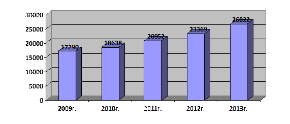 Данные о распределении российских домохозяйств по уровню доходов показывают, что за период с 2009 по 2013 год доля домохозяйств с наиболее высокими доходами (свыше 45000 руб.) увеличилась в 3 раза, в то время как доля самых низкодоходных (до 5000 руб.) уменьшилась почти в 3 раза, а доля средне - доходных (14 000 – 19000 руб.) – увеличилась менее чем в 1, 1 раза. В целом, можно сделать вывод, что доля населения с низкими доходами уменьшается, а доля населения с доходами выше среднего и высокими доходами растет, что обусловлено, прежде всего, ростом размера среднемесячной начисленной заработной платы, о чем свидетельствую данные рисунка 9.