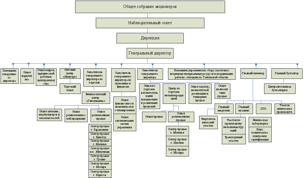 Органами управления общества являются: · общее собрание акционеров; · наблюдательный совет; · исполнительные органы (дирекция и генеральный директор). Контрольным органом общества является ревизионная комиссия. Общее собрание акционеров является высшим органом управления общества. Общее руководство деятельностью общества в период между общими собраниями акционеров осуществляет наблюдательный совет. Исполнительные органы подотчетны общему собранию акционеров и наблюдательному совету и организуют выполнение решений этих органов. ОАО «ГОМЕЛЬХИМТОРГ» имеет организационную структуру, представленную на рисунке 2.2.