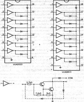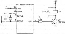 Управление реле Для питания обмотки реле требуется ток, превышающий 20 мА. поэтому напрямую подключить к микроконтроллеру его нельзя. Дли управления реле, можно применять простейший усилитель — транзисторный ключ. На рис. 3 показан пример схемы с реле. Диод, подключенный параллельно обмотке реле, нужен для защиты схемы от ЭДС самоиндукции, появляющейся в процессе коммутации обмотки. Совершенно аналогично можно включать не реле, а какую-либо другую нагрузку, например, лампу накаливания и т. д. В случае, если необходимо управлять большим числом реле, или других мощных нагрузок, удобно применять микросхемы ULN2003 или ULN2803. Эти микросхемы содержат соответственно, 7 и 8 транзисторных ключей на составных транзисторах (схема Дарлингтона) Они позволяют управлять нагрузкой до 500 мА при напряжении до 50 В. При этом входы этих микросхем можно подключать непосредственно к линиям портов ввода/вывода микроконтроллера. Внутри микросхем уже имеется встроенный защитный диод, который можно подключать или отключать, осуществляя внешние соединения. На рис. 4 показан пример схемы с использованием микросхемы ULN2003.