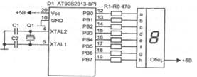 Для включения нагрузки следует сформировать на соответствующем выводе микроконтроллера уровень «1». При этом ток, потребляемый от вывода порта микроконтроллера, не превышает допустимый, в то же время, как осуществляется управление достаточно мощной нагрузкой. Управление светодиодными цифровыми индикаторами Так как светодиодные цифровые индикаторы, no-существу, представляют собой набор светодиодов специальной формы, расположенные так, чтобы при зажигании различных их комбинаций, получились цифры, управление ими принципиально не отличается от управления отдельными светодиодами. На рис. 6 изображен пример схемы управления семисегментным светодиодным индикатором. Легко увидеть, что если потребуется управлять большим числом индикаторов, количества выводов портов ввода/вывода будет недостаточно. Для преодоления этого препятствия применяется динамическая индикация. На рис. 6 показан пример схемы динамической индикации. Идея, лежащая в основе работы этой схемы очень проста — человеческий глаз достаточно инерционен, поэтому можно зажигать не все индикаторы одновременно, а только один из них, потом через короткое время другой и так далее. Так как переключение индикаторов происходит достаточно быстро, человеку кажется, что все индикаторы горят.