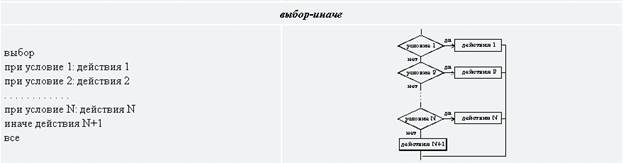3. Базовая структура цикл. Обеспечивает многократное выполнение некоторой совокупности действий, которая называется телом цикла. Основные разновидности циклов представлены в таблице: