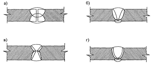 Рис. 3.1. Вертикальные стыковые соединения стенки: а - без разделки кромок; б - со скосом двух кромок; в - с двумя скосами кромок; г - с криволинейным скосом кромок. Вертикальные соединения листов в прилегающих поясах стенки должны быть смещены относительно друг друга на расстояние не менее 8 t, где t - наибольшая из толщин листов прилегающих поясов. Для резервуаров II и III класса при изготовлении стенки из рулонных полотнищ допускаются вертикальные заводские и монтажные стыковые соединения без смещения. Расстояния между швами патрубков, усиливающих листов и швами стенки должны быть не менее: до вертикальных швов - 250 мм, до горизонтальных швов - 100 мм. Вертикальные соединения первого пояса стенки должны располагаться на расстоянии не менее 100 мм от стыков окраек днища. 3.2.2 Горизонтальные соединения стенки. Горизонтальные соединения листов должны выполняться двусторонними стыковыми швами с полным проплавлением (рис. 3.2).