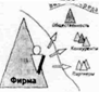 Если символически изобразить фирму (бизнес-структуру) в виде треугольника, а внешнюю среду, в которой функционирует фирма, - в виде некоторого не ограниченного жестко пространства вокруг треугольника, то схематически уровни функционирования (деятельности) бизнес-структуры (фирмы) можно представить следующим образом: