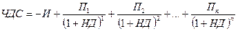 Для долгосрочных инвестиционных проектов оценка эффективности инвестиций требует обязательного учёта фактора времени. Прибыли сегодня и в будущем имеют разную «ценность», что связано с инфляционными процессами, и возможностью получить доход по депозиту. Для приведения затрат и результатов к единому моменту времени обычно используется принцип дисконтирования. Дисконтирование (затрат, стоимости, прибыли и т.д.) – это приведение их к одному определённому моменту времени с использованием нормы дисконта (НД). Норма дисконта может выбираться, например, на уровне действующей на момент расчёта банковской процентной (учётной) ставки (это ставка рефинансирования плюс 1, 5%). На основе нормы дисконта рассчитывается коэффициент дисконтирования, использующий формулу сложных банковских процентов по депозиту: