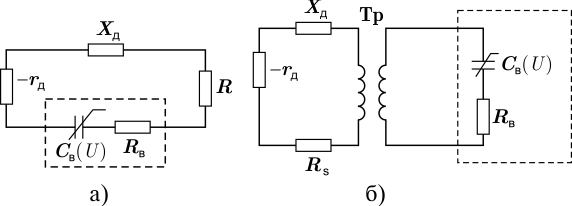 Значительно лучшие результаты можно получить при полном или частичном включении варикапа в контур генератора, что эквивалентно включению дополнительной управляемой емкости C в (U) и сопротивления потерь варикапа R в. При полном включении варикап включается непосредственно в контур генератора (последовательно или параллельно диоду); при частичном включении он связан с контуром генератора с помощью трансформатора связи либо специального элемента связи.