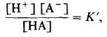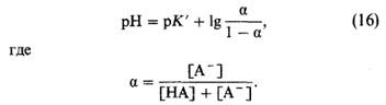 Общее понятие о буферных системах. Прежде всего необходимо вспомнить, что реакции диссоциации слабой кислоты НА на ионы водорода Н+ и сопряженное основание А- подчиняются закону действующих масс. Кинетику таких реакций описывает уравнение Подобное уравнение для буферных систем, выведенное из закона действующих масс, называется уравнением Гендерсона- Гассельбальха. Величина рK', так же как и К', -константа, характеризующая свойства системы (рК'= -lgK'). Уравнение можно представить в следующем виде: