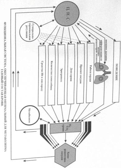 Импульсы, поступающие от центральных и периферических хеморецепторов, являются необходимым условием периодической активности нейронов дыхательного центра и соответствия вентиляции легких газовому составу крови. Последний является жесткой константой внутренней среды организма и поддерживается по принципу саморегуляции путем формирования функциональной системы дыхания. Системообразующим фактором этой системы является газовая константа крови. Любые ее изменения являются стимулами для возбуждения рецепторов, расположенных в альвеолах легких, в сосудах, во внутренних органах и т. д. Информация от рецепторов поступает в ЦНС, где осуществляется ее анализ и синтез, на основе которых формируются аппараты реакций. Их совокупная деятельность приводит к восстановлению газовой константы крови. В процесс восстановления этой константы включаются не только органы дыхания (особенно ответственные за изменение глубины и частоты дыхания), но и органы кровообращения, выделения и другие, представляющие в совокупности внутреннее звено саморегуляции. При необходимости включается и внешнее звено в виде определенных поведенческих реакций, направленных на достижение общего полезного результата - восстановление газовой константы крови.