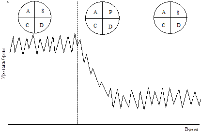 Рис. 5.11 Графическое представление цикла Деминга а – цикл улучшения качества PDCA; б – цикл обеспечения качества SDCA; в – применение циклов Деминга SDCA и PDCA Цикл обеспечения качества Деминга (см. рис. 5.11 б), часто обозначаемый в тексте SDCA, применяется после того, когда достигнутое улучшение качества становится нормой (стандартом). Этот цикл SDCA предусматривает осуществление деятельности по схеме: - Standard (установите норму, стандарт выполнения деятельности), - Do (делайте, выполняйте работу в соответствии со стандартом), - Check (контролируйте выполнение работы по стандарту), - Act (действуйте в соответствии с результатами контроля). Иллюстрация применения циклов Деминга SDCA и PDCA приведена на рис. 5.11 в. Видно, что до начала работ с целью улучшить качество продукции, рассматриваемый на рис. 5.11 в процесс осуществлялся в соответствии с циклом SDCA при достаточно высоком уровне брака. Причем, этот уровень брака соответствовал требованиям нормативной документации, устанавливавшей стандарт выполнения процесса. После того, как стала очевидной необходимость повысить качество продукции, команда специалистов, созданная для достижения целей улучшения, руководствовалась циклом PDCA. На первом этапе эта команда запланировала (Plan) мероприятия по улучшению качества. После этого были выполнены (Do) запланированные мероприятия, например, изготовлена опытная партия модернизированной продукции. Затем была осуществлена проверка (Check) качества изготовленной партии. Если эта проверка показала, что запланированные улучшения качества не достигнуты, то следует действовать (Act) в соответствии с результатами проверки. Возможно придется повторить цикл PDCA несколько раз, пока не будут получены необходимые результаты по улучшению качества. После того, когда проверка покажет, что требуемое улучшение качества достигнуто, следует действовать (Act) в соответствии с положительными результатами проверки. Например, предложенные мероприятия по улучшению качества должны стать нормой (стандартом) дальнейшего осуществления процесса в соответствии с циклом обеспечения качества SDCA.