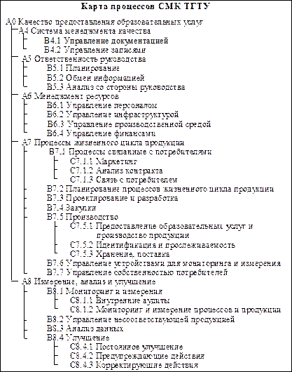 Первую команду, обеспечивающую руководство разработкой и внедрением системы менеджмента качества и определение стратегии организации в области качества, в которую входят высшее руководство и представитель руководства по качеству, возглавляет генеральный директор. В состав команды входят также главный экономист (руководитель планово-финансового управления), главный бухгалтер, начальник производственного отдела, специалисты по маркетингу и другие специалисты организации. Эта команда ответственна за организацию изучения стандартов ИСО серии 9000 версии 2008 года руководителями, специалистами, а также за последующее использование в деятельности организации восьми принципов менеджмента качества, изложенных в [6, 16]. Особое внимание следует уделить разработке системы стимулирования и мотивации персонала, вовлечению сотрудников в деятельность по внедрению системы менеджмента качества. Эта команда формирует цели разработки и внедрения систем менеджмента качества, разрабатывает программу работ и доводит ее до сотрудников организации через руководителей подразделений и уполномоченных по качеству в подразделениях. В дальнейшем первая команда осуществляет оперативное руководство всей работой, контролирует выполнение программы работ, при необходимости разрешает конфликтные и спорные вопросы. Согласно ГОСТ Р ИСО 9004-2010 [16] Политику в области качества рекомендуется увязывать с общей стратегией организации. Поэтому одним из основных результатов работы этой команды является определение стратегии организации, а также подготовка, опубликование и последующая корректировка Политики и целей в области качества. Вторая команда, возглавляемая техническим директором (главным инженером), предназначена [32, 33] для выделения и описания основных бизнес-процессов организации и для идентификации процессов системы менеджмента качества в соответствии с рекомендациями [16] и требованиями [23]. Команда комплектуется из руководителей организации и начальников подразделений (цехов, отделов, служб), ответственных за соответствующие этапы (фазы) жизненного цикла продукции: - маркетинг и изучение рынка; - проектирование и разработка продукции; - планирование и разработка процессов; - закупки (материально-техническое снабжение); - производство и предоставление услуг; - проверки и контроль качества и т.д. Для идентификации процессов системы менеджмента качества, в состав команды входят руководители и специалисты, ответственные за соответствующие процессы внедрения систем менеджмента качества, в частности, представитель руководства по качеству, начальник отдела управления качеством, начальники подразделений. При описании порядка внедрения процессов системы менеджмента качества команда последовательно выполняет следующие действия [32-34]: · идентификация процессов, в том числе присвоение процессам наименования; · назначение владельцев процессов; · идентификация входов, выходов, ресурсов и управляющих воздействий процессов системы менеджмента качества; · определяется последовательность и взаимодействие процессов. Ниже, в качестве примера, приведена карта процессов (рис. 7.3) системы менеджмента качества Тамбовского государственного технического университета (ТГТУ), идентифицированных [32] на этапе предварительного исследования процесс