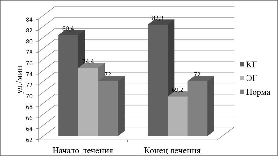 Примечание: p – достоверность различий между исходными показателями и показателями в конце реабилитации. КГ – контрольная группа. ЭГ – экспериментальная группа. В начале реабилитационных мероприятий исходные данные ЧСС в контрольной и экспериментальной группах достоверно не различались между собой (контрольная группа - 80, 4 ± 3, 2 уд./ мин; экспериментальная группа - 82, 3 ± 4, 0уд./ мин, (p> 0, 05)). К концу курса лечения данный показатель снизился как в контрольной, так и в экспериментальной группах (в контрольной группе до 74, 4 ± 3, 2уд./ мин; в экспериментальной группе до 69, 2 ± 4, 0 уд./ мин), но у пациентов экспериментальной группы данный показатель достоверно лучше, чем в контрольной группе (p< 0, 05). Сравнительный анализ результатов исследования показал, что ЧСС у пациентов экспериментальной группы к концу курса реабилитации достоверно ниже контрольной на 7, 5 % (см. табл. 4, рис. 1).