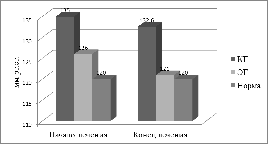 Рис. 1 Изменение частоты сердечных сокращений в контрольной и экспериментальной группах Условные обозначения: КГ – контрольная группа; ЭГ – экспериментальная группа; В начале реабилитационных мероприятий исходные данные систолического артериального давления в контрольной и экспериментальной группах достоверно не различались между собой (контрольная группа - 132, 6 ± 3, 2 мм рт.ст.; экспериментальная группа - 135, 0 ± 4, 8мм рт.ст., (p> 0, 05)). К концу курса лечения данный показатель снизился как в контрольной, так и в экспериментальной группах (в контрольной группе до