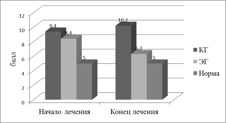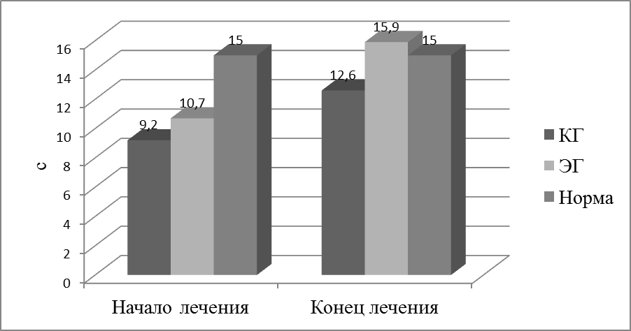 Рис. 8 Изменение показателей пробы Ромберга в контрольной и экспериментальной группах Условные обозначения: КГ – контрольная группа; ЭГ – экспериментальная группа; Заключение Таким образом, анализ результатов проведенного исследования показал, что использование в занятиях лечебной физической культуры упражнений на тренажере «Беговая дорожка WNQ F1-7000F» в сочетании с фитбол-гимнастикой в реабилитации женщин 30-35 лет с вегето-сосудистой дистонией в тренирующем периоде достоверно улучшает все изучаемые показатели, по сравнению с контрольной группой, что говорит об эффективности усовершенствованной нами методики.
