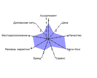 Оценку конкурентоспособности ООО «Юргинский машзавод» необходимо начать с идентификации конкурентов. Конкурентами являются компании, реализующие горношахтное оборудование, в частности механизированные крепи для отработки тонких угольных пластов. Сегодня на рынке горношахтного оборудование существует два сильных конкурента это «CATERPILLAR» и «JOY». По объему продаж горно-шахтного оборудования в 2012 году эти производители – безусловные лидеры по объему производства и продаж. Они имеют более развитую сеть дилеров на территории России и стран СНГ, поскольку дилеры концентрируются вокруг компаний имеющих наибольший спрос. Оценка конкурентоспособности проведена графическим методом – построения многоугольника конкурентоспособности с выделением основных показателей конкурентоспособности. 1. Характеристика ассортимента конкурирующих предприятий. 2. Характеристика цен конкурирующих предприятий. 3. Характеристика качества товаров конкурирующих предприятий. 4. Характеристика уникальных свойств продукции конкурирующих предприятий. 5. Характеристика уровня сервиса и культуры обслуживания конкурирующих предприятий. 6. Характеристика уровня привлекательности торговой марки – «бренда» конкурирующих предприятий. 7. Характеристика рекламной и маркетинговой компаний конкурирующих предприятий. 8. Характеристика месторасположения конкурирующих предприятий 9. Характеристика дилерской сети конкурирующих предприятий. Для экспертной оценки была разработана шкала конкурентных преимуществ предприятий по вышеуказанным факторам. Шкала оценки преимуществ была составлена по пятибалльной системе, где градация 5 соответствует позитивной оценке конкурентного преимущества, градация 1 – отрицательной оценки, градация 3 - нейтральное отношение, градации 2 и 4 означают оценку «скорее отрицательную» и «скорее положительную» соответственно. Полученные данные оформлены в сравнительные таблицы. Характеристика ассортимента конкурирующих предприятий Таблица 6