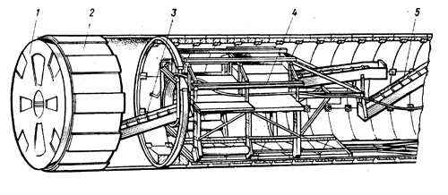 Рисунок 5 Механизированный щит Операции в процессе работы проходческого щита: разработки грунта в забое, передвижения щита, устройства обделки в хвостовой части и нагнетания цементного раствора за собранную обделку. Одновременно ведутся выдача грунта из забоя и откатка его в шахту с подъемом на поверхность, а также доставка к щиту сборных элементов обделки. Наиболее трудоемкой и сложной операцией является разработка грунта. Для определения и контроля положения щита применяют лазерные приборы, который крепится к отделке. Для придания лазерному лучу нужного направления применяют отвесы, а в профиле используется капроновая леска. Новые нити и отвесы закрепляются через каждые 100-150 метров. Крупнейшими мировыми производителями проходческих щитов являются следующие компании: 1 «Ловат» (Канада) 2 «Роббинс», «Мемко» (США) 3 «Хитачи», «Кавасаки», «Мицубиси», «Исикаваи ма Харима» (Япония) 4 «Херренкнехт», «Вайсс унд Фрайтаг», «Баде унд Тилен», «Маннес ман Демаг», «Ноэль», «Зольтау» (Германия). 2) Проходческие комбайны Проходческий комбайн – сложная многоприводная машина, обеспечивающая выполнение большого числа основных и вспомогательных операций рабочих процессов проведения и крепления подготовительных выработок, предназначенная для механизированного разрушения горных пород, погрузки горной массы в транспортные средства (вагонетки, конвейер, перегружатель)[20]. Основными производителями проходческих комбайнов в России являются: 1 «Новокраматорский машиностроительный завод» 2 «Копейский машиностроительный завод» 3 «Юргинский машиностроительный завод» Украина: 1 «Ясиноватский машиностроительный завод» 2 «Горловский машиностроитель» В мире: 1 Dosco Overseas Engineering LTD; 2 Eickhoff Bergbautechnik GMBH; 3 JOY. На рисунке 6 приведен пример проходческого комбайна.