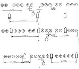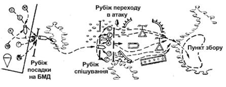 Мал.1 Бойовий порядок парашутно-десантного взводу, що наступає в пішому порядку. Бойові машини діють: а - за цепом відділень; б - у цепу відділень; в — на флангах відділень По мірі знищення вогневих, особливо протитанкових, засобів противника й залежно від умов місцевості бойові машини можуть висуватися безпосередньо в цеп взводу й діяти попереду нього. Відділення в пішому порядку наступає на фронті до 50 м. Інтервали між солдатами в цепу становлять 6-8 м, між відділеннями - до 50 м, а між взводами до 100 м. Для зручності ведення вогню й кращого пристосування до місцевості солдати в цепу можуть трохи висуватися вперед або приймати убік, не порушуючи загального напрямку фронту наступу цепу й не заважаючи діям сусідів. Інтервали між солдатами (6-8 м) знижують втрати особового складу від вогню стрілецької зброї й артилерії противника, забезпечують найкращі умови для застосування зброї відділення й взаємодіючих з ним вогневих засобів, зберігають ударну силу цепу, дозволяють командирові відділення впевнено управляти підлеглими голосом і сигналами. Проміжки між відділеннями, взводами необхідні для ведення вогню в них бойовими машинами або доданими вогневими засобами. Крім того, ці проміжки дають підрозділам і окремим вогневим засобам можливість повніше використовувати вигідні умови місцевості для ведення вогню, потайливого пересування, здійснення маневру вогнем і підрозділами, а також знижують ефективність вогню противника. Основною формою маневру при захопленні об'єктів є вихід на фланги й у тил противника, що обороняє об'єкт для атаки з різних напрямків по найбільш уразливих місцях. Підрозділи, призначувані для захоплення майданчика приземлення й для прикриття головних сил десанту, знищують противника на майданчику приземлення, швидко висуваються на вигідні для ведення бою рубежі в готовності до відбиття атак противника. Швидкий вступ підрозділів повітряного десанту в бій після приземлення є одним з найважливіших факторів, що забезпечують раптовість дій і успішне виконання бойового завдання. Для швидкого збору особового складу, відшукання бойової техніки й приведення підрозділів у готовність до вступу в бій застосовуються: десантування особового складу разом з бойовою технікою; викид з головних літаків дублерів механіків-водіїв бойових машин і водіїв інших видів бойової техніки й автотранспорту; десантування з літаків у кілька потоків для збільшення купчастості викиду й інші прийоми. При десантуванні вночі, а також на майданчик приземлення на закритій місцевості або вилучену від об'єкта захоплення підрозділ, як правило, збирається в районі (пункті) збору, який може призначатися поблизу границі майданчика приземлення на напрямку висування підрозділів до об'єкта захоплення.Район (пункт) збору позначається світловими сигналами й радіотехнічними засобами збору. У районі (пункті) збору особовий склад і бойова техніка розташовуються роті — повзводно в готовності до дій по знищенню противника з будь-якого напрямку. Залежно від обстановки підрозділи можуть розташовуватися в передбойових порядках, у колонах і в бойових порядках. Командири підрозділів зобов'язані організувати спостереження, безпосередню охорону, перевірити наявність особового складу, бойової й іншої техніки, їх стан, при необхідності уточнити бойові за