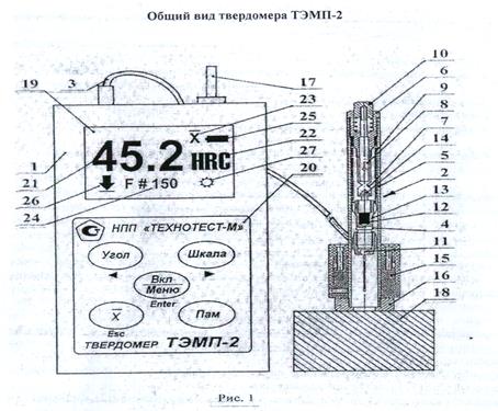 Твердомер динамикалық қ озғ алысты портативті электрондық бағ дарламаланғ ан аспап ретінде кө рінеді, ол корпусқ а қ ұ растырылғ ан электрондық блоктан (1) (1-суретті қ араң ыз) жә не кө рсеткіштен (2) тұ рады, бұ л екеуі экрандалғ ан кабельмен жалғ анғ ан, сондай-ақ электрондық блок корпусының батареялық бө лігіне орнатылатын А-316 типтес екі қ оректену элементтері бар. Аспаппен қ аттылық ты ө лшеу принципі – динамикалық, қ ұ лау жылдамдығ ы мен кө рсеткіш ударнигінің (4) секірмесі қ атынасындағ ы анық тамағ а негізделген, электрондық блок арқ ылы HL шартты бірліктеріне аспап микропроцессорының (HB, HRS, HSD, HV) қ аттылық тар қ атарына қ осылып саналады. Қ айта санау алгоритмі аспапта бағ дарламаның кезінде жасалып, оның энергиядан тә уелсіз жадында сақ талады. Қ аттылық шкаласы аспапқ а сә йкес келетін қ аттылық тың ү лгілік шектері немесе белгілі қ аттылық ү лгілері бойынша бағ дарламаланады. Кө рсеткіш (2) бағ ыттаушы тү тікшеден (5), взвод механизмінен (6) (қ ұ рамына цангалы қ ұ быр (7), шток (8), негізгі серіппе (9) жә не тү сіруші батырма (10)), ударник (4) (қ ұ рамына балқ ытылатын шар тә різдес индентор (11), тұ рақ ты магнит (12), корпус (13) жә не тығ ындар (14) Кө рсеткіштің енгізілуі ә рбір қ аттылық ты ө лшеу алдында итергіш (17) кө мегімен цангалы қ ұ бырдағ ы ударник тығ ынының фиксациясы сезілгенге дейін іске асырылады. Осы кезде негізгі серіппенің ударникпен қ осылуы болады. Тө мен тү сіруші батырманы басқ анда шток цангалы қ ұ бырды қ ысып, серіппе ударникті «атып жібереді». Ударник бағ ыттаушы тү тік ішінде қ озғ ала отырып, ударник ө лшенетін дененің (18) бетіне идентормен соғ ып, одан кері серпіледі. Бұ л кезде тұ рақ ты магнит сә йкес келетін қ ұ лау жылдамдығ ы мен ударниктің кейін секіруіне пропорционалды боп келетін ЭДС индуктивтік катушкасына кіргізіледі. Ударниктің қ ұ лау жә не кері секіруі кезіндегі сигнал экрандалғ ан кабель арқ ылы электрондық блокқ а беріледі. Твердомердің электрондық блогы пластмассалық (немесе металдық) корпусқ а орнатылғ ан. Корпустың беттік жағ ында сұ йық кристалдық индикатор ЖКИ (19) жә не пернетақ та (20) орналасқ ан, пернетақ таның мынадай 5 батырмасы бар: - қ осу «Вкл/Меню» батырмасы (аспапты қ осқ ан кезде бұ л батырма аспап «Менюіне» кіруге мү мкіндік береді, ал «Менюге» кірген соң «Enter» батырмасының қ ызметтерін атқ арады); - кө рсеткіштің «Угол» жағ дайын таң дау («Менюге» кірген соң «Меню» жә не сандарды азайту пункттерінің таң дауы функцияларын атқ арады); - «Х» ө лшем нә тижелерін орташалау («Менюге» кірген соң «Esc» батырмасының қ ызметтерін атқ арады); - «Пам» мә ліметтерді есте сақ тау. Электрондық блоктың беткі жағ ында итергіш (17), 3В қ оректендіру блогымен байланыстыруғ а арналғ ан алмалы бө лшек жә не кө рсеткішпен немесе ЭВМ-мен байланыстыруғ а арналғ ан біріккен аудио-разъем бар. Электрондық блоктың артқ ы жағ ында шильд (онда ө ндіруші мекеме, твердомер типі, қ оректендіру параметрлері жә не аспаптың шық қ ан зауыттық номері кө рсетілген), сондай-ақ батареялық бө ліктің қ ақ пағ ы орналасқ ан. А-316 типті батареялар (немесе аккумуляторлар) батареялық бө лікте кө рсетілген полярлық қ а сә йкес орнатылады. Аспап индикаторында (19), оны «Вкл/Меню» батырмасы арқ ылы іске қ осқ ан кезде қ осқ анғ а дейінгі сә йкес шкала бойынша ө лшеудің нә тижесі, сондай-ақ басқ а да қ осымша ақ парат кө рінеді. Аспап ә р тү рлі режимдегі жұ мысын
