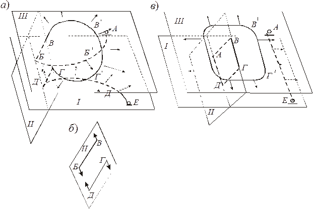 Рис. 3.25. Движение дислокации после двойного поперечного скольжения в случае «длинных» выбросов на первом этапе: а – краевые участки Б′ Б и ДД′ проходят под участками ВВ′ и ГГ′; б – схема сил, действующих на краевые участки БВ и ГД в плоскости II со стороны остальных частей дислокации; в – образование скользящих дислокационных петель в плоскостях II и III и восстановление прямолинейной дислокации в плоскости I В плоскости I отрезки краевой ориентации ББ' и ДД' сталкиваются и аннигилируют, при этом восстанавливается исходная прямолинейная дислокация АЕ и рождается отрезок винтовой ориентации БД противоположного знака по отношению к исходной дислокации. В результате в плоскости II образуется скользящая дислокационная петля БВГД. Итак, в итоге этого этапа двойного поперечного скольжения восстанавливается исходная дислокация АЕ и рождаются две скользящие дислокационные петли В ¢ Г' в плоскости III и БВГД в плоскости II. Петля В ¢ Г ¢ и дислокация АЕ быстро уходят от места двойного поперечного скольжения, и начинается второй этап, связанный с петлей БВГД. Так как краевые дислокации БВ и ГД имеют противоположный знак, то под действием внешнего напряжения они движутся в противоположные стороны (рис. 3.26, а). При этом силы, действующие на концы Б и В отрезка БВ, направлены в одну сторону (так же, как и на концах Г и Д отрезка ГД), вследствие чего эти отрезки движутся в разные стороны и их концы перестают быть хорошими точками закрепления.