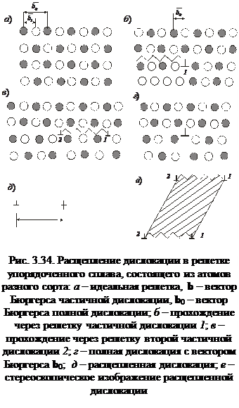 Этот результат можно было бы получить сразу, зная атомное строение идеальной решетки. Действительно, вектор b, добавленный к координате любого атома, переводит его в неэквивалентное положение: атом А в положение атома В и наоборот. Только вектор b 0 = 2 b удовлетворяет условию трансляционной симметрии, т. е. переводит все атомы в эквивалентные положения. На рис. 3.34, б видно, что движение второй частичной дислокации 2 в той же плоскости скольжения уничтожает в ней дефект упаковки, создаваемый первой частичной дислокацией 1. Следовательно, две частичные дислокации 1 и 2 с дефектом упаковки между ними эквивалентны одной полной дислокации (см. рис. 3.34, г). Такой дефект, когда две частичные дислокации с дефектом упаковки между ними эквивалентны полной дислокации, называется расщепленной дислокацией. В более сложных случаях расщепленная дислокация может состоять из трех, четырех и т. д. частичных дислокаций и сооветственно из двух, трех и т. д. полосок дефектов упаковки. Рассмотрим расщепление дислокации – превращение полной дислокации в расщепленную (рис. 3.34, г, д, в). Энергия полной дислокации