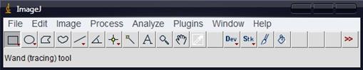Рисунок 2.3 – Основне вікно програми ImageJ Програма дозволяє вимірювати відстані й кути, проводити різні геометричні перетворення, такі як масштабування, поворот або віддзеркалення. Вона одночасно підтримує велику кількість зображень, обмеження пов'язане тільки з обсягом доступної пам'яті. У нашій роботі ми використовували програму ImageJ для визначення Розмірного складу частинок, зокрема площу проекції кожної окремої частинки на поверхню, середню та загальну площу частинок, а також розподіл частинок за площею проекцій. У програмі відкриваємо зображення за допомогою меню File – Open. Перед початком обрахунків потрібно виділити робочу область фотографії та обробити її. Використовуючи функцію Threshold автоматично налаштовуємо верхні і нижні значення порога для сегментування потрібної області і заднього фону зображення. При заданні порогу на зображенні він, для зручності, виділяться червоним кольором, а задній фон залишається сірим(рис.2.4).
