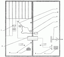 1- каток; 2 - ручная горелка; 3 - бачок с дизтопливом; 4 - компрессор; 5 - ручная тележка; 6 - контейнер; 7 - кран крышевой; 8 - трап; 9 - ящик с песком и огнетушители; 10 - водосточные воронки;