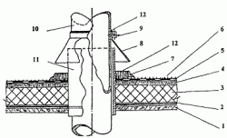 1 - сборная железобетонная плита покрытия; 2 - пароизоляция; 3 - теплоизоляция; 4 - выравнивающая стяжка; 5 - основной кровельный ковер; б - крупнозернистая посыпка; 7 - рамка из уголка; 8 - зонт; 9 - хомут; 10 - труба; 11 - патрубок с фланцем; 12 - герметизирующая мастика