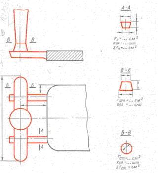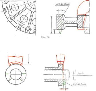 Рис. 8.10. Изображение отъемных частей модели 5) Изображение и обозначение литниковой системы. Литниковую систему выполняют в масштабе изображения детали сплошной тонкой линией красного цвета (рис. 8.11–8.12). Сечения элементов литниковой системы не штрихуют. У каждого сечения элементов литниковой системы необходимо указывать площадь сечения в квадратных сантиметрах, количество элементов и суммарную их площадь. При выполнении литниковой системы в керамических сифонных трубках их изображение не приводят. В технических требованиях помещают надпись: «На участке … литниковую систему выполнять в керамических трубках по ГОСТ 11586–69».