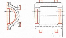 3) Изображение и обозначение стержней Стержни, их знаки и фиксаторы, стержни-перемычки, разделительные диафрагмы легкоотделяемых прибылей и знаки модели изображают в масштабе чертежа сплошной тонкой линией синего цвета (рис. 8.6–8.8). Если близкое расположение изображений на чертеже детали не позволяет показывать знаки стержней в масштабе, то разрешается делать разрыв знака или изображать его не в масштабе (см. рис. 8.7).