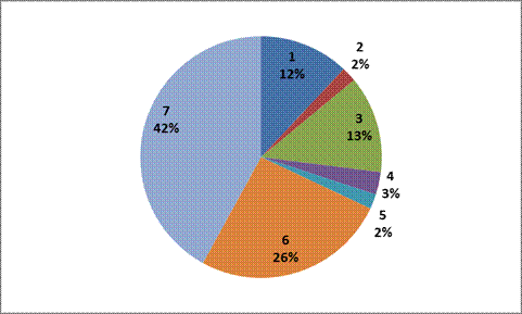 Рис.11а. Соотношение мировых пород по категориям статуса риска (все виды) Обозначения (здесь и далее): 1- критическая; 2 – критическая, контролируемая; 3 – в состоянии опасности; 4 – в состоянии опасности, контролируемая; 5 – исчезнувшие; 6 – вне состояния риска; 7 – состояние неизвестно.