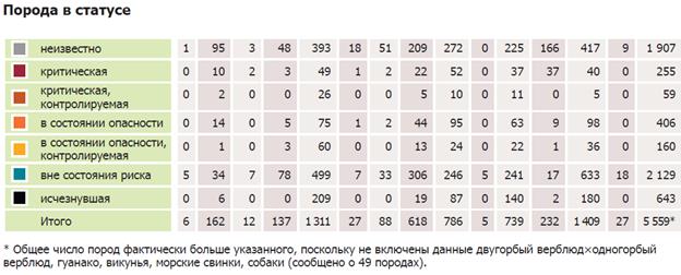 В таблицах 15 и 16 представлено число исчезнувших пород млекопитающих и птиц по видам и регионам. Европа и Кавказ имеет наибольшее число исчезнувших пород млекопитающих и птиц – 16% из всех известных пород имеют статус исчезнувших. Вместе с тем, в Северной Америке отмечена самая высокая доля исчезнувших пород (25%) среди зарегистрированных. Преобладание Северной Америки, Европы и Кавказа по этим показателям возможно связано с уровнем породного учета в этих регионах. Год исчезновения приведен только для 27% (188) исчезнувших пород. Пятнадцать пород исчезли до 1900 года, 111 – с 1900 по 1999 гг., еще 62 прекратили свое существование в последние 6 лет (табл. 17).