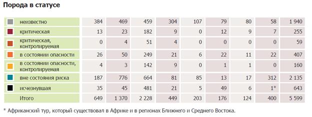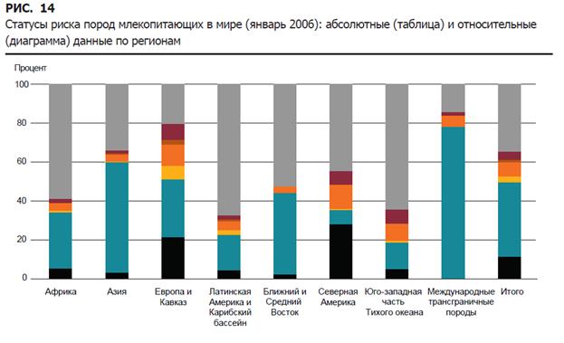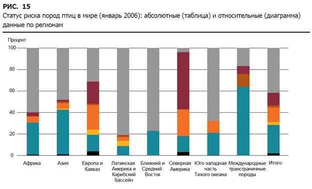 5 В целом 1 491 порода (или 20%) классифицирована как «находящиеся в состоянии риска» (вставка 6). Для видов млекопитающих относительное число пород, классифицированных как «находящиеся в состоянии риска» ниже (16%), чем для видов птиц (30%, рис. 11а, б). Однако, в абсолютных показателях число пород, находящихся в состоянии риска выше среди млекопитающих (881 порода), чем среди птиц (610 пород). На рисунке 12 представлены данные о статусе риска среди видов млекопитающих. Следует отметить, что в крупном рогатом скоте имеется наибольшее число исчезнувших пород. Лошади (23%), кролики (20%) и свиньи (18%) представляют виды, которые имеют наивысшую пропорцию пород, находящихся в состоянии риска. Приведенные данные также указывают большое число пород, для которых статус риска не определен. Проблема выглядит особенно острой для кроликов (статус риска 72% пород не определен), оленей (66%), ослов (59%), дромадеров (58%). Дефицит данных является серьезным препятствием для разработки эффективных приоритетных программ сохранения пород и мер по их реализации. Наибольшее число исчезнувших пород (209) обнаружено у крупного рогатого скота. Также имеются данные о существенном числе исчезнувших пород свиней, овец и лошадей. Вероятно, это еще не полная картина исчезновения пород, и вполне вероятно, что утеря многочисленных пород вообще не была установлена. Среди видов птиц куры имеют, безусловно, самое высокое число пород в состоянии риска (рис. 13). Это частично связано с общим их количеством в мире, однако пропорция пород, находящихся в состоянии риска, среди них также высока (33%). Относительно высокая численность пород в состоянии риска определена среди индеек и гусей. Как и у млекопитающих, существует большое количество пород птиц, для которых данные о статусе отсутствуют. Исчезнувшие породы, главным образом, определены в популяции кур. Описаны также насколько таких случаев среди уток, цесарок и индеек. Рисунки 14 и 15 показывают распределение пород, находящихся в состоянии риска по регионам для видов млекопитающих и птиц, соответственно. Регионы с самой высокой долей пород, классифицированных как «в состоянии риска» - Европа и Кавказ (28% пород млекопитающих и 49% пород птиц), Северная Америка (20% пород млекопитающих и 79% птиц). Европа и Кавказ и Северная Америка – регионы, которые имеют наиболее высокоспециализированную индустрию домашнего скота, где в производстве превалирует небольшое количество пород. В абсолютном выражении, регион Европа и Кавказ безусловно имеет самое высокое число пород в состоянии риска. Несмотря на очевидное доминирование этих двух регионов, проблемы в других регионах могут быть неясными по причине большого количества пород с неизвестным состоянием риска. В Латинской Америке и Карибах, например, 68% и 81% пород млекопитающих и птиц, соответственно, классифицированы как породы, для которых состояние риска неизвестно, в то время как данные по Африке составляют 59% пород для млекопитающих и 60% – для птиц.