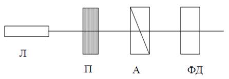 где Л — лазер, П — двулучепреломляющая пластинка, А — анализатор (поляризатор), ФД — фотодиод. Расчётные формулы.