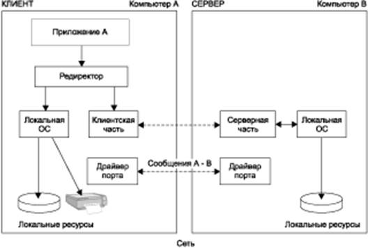 Очень удобной и полезной функцией клиентской программы является способность отличить запрос к удаленному файлу от запроса к локальному файлу. Если клиентская программа умеет это делать, то приложения не должны заботиться о том, с каким файлом они работают (локальным или удаленным), клиентская программа сама распознает и перенаправляет (redirect) запрос к удаленной машине. Отсюда и название, часто используемое для клиентской части сетевой ОС, - редиректор. Иногда функции распознавания выделяются в отдельный программный модуль, в этом случае редиректором называют не всю клиентскую часть, а только этот модуль.