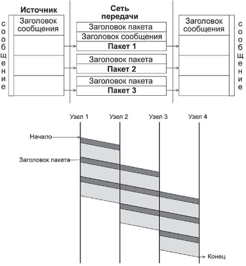 Коэффициент пульсации трафика отдельного пользователя сети, равный отношению средней интенсивности обмена данными к максимально возможной, может достигать 1: 50 или даже 1: 100. Если для описанной сессии организовать коммутацию канала между компьютером пользователя и сервером, то большую часть времени канал будет простаивать. В то же время коммутационные возможности сети будут закреплены за данной парой абонентов и будут недоступны другим пользователям сети. При коммутации пакетов все передаваемые пользователем сообщения разбиваются в исходном узле на сравнительно небольшие части, называемые пакетами. Напомним, что сообщением называется логически завершенная порция данных — запрос на передачу файла, ответ на этот запрос, содержащий весь файл и т.д. Сообщения могут иметь произвольную длину, от нескольких байт до многих мегабайт. Напротив, пакеты обычно тоже могут иметь переменную длину, но в узких пределах, например от 46 до 1500 байт. Каждый пакет снабжается заголовком, в котором указывается адресная информация, необходимая для доставки пакета на узел назначения, а также номер пакета, который будет использоваться узлом назначения для сборки сообщения (рис. 3). Пакеты транспортируются по сети как независимые информационные блоки. Коммутаторы сети принимают пакеты от конечных узлов и на основании адресной информации передают их друг другу, а в конечном итоге — узлу назначения.