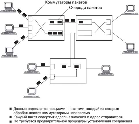 Более высокая эффективность сетей с коммутацией пакетов по сравнению с сетями с коммутацией каналов (при равной пропускной способности каналов связи) была доказана в 60-е годы как экспериментально, так и с помощью имитационного моделирования. Здесь уместна аналогия с мультипрограммными операционными системами. Каждая отдельная программа в такой системе выполняется дольше, чем в однопрограммной системе, когда программе выделяется все процессорное время, пока ее выполнение не завершится. Однако общее число программ, выполняемых за единицу времени, в мультипрограммной системе больше, чем в однопрограммной. Задержки в источнике передачи:
