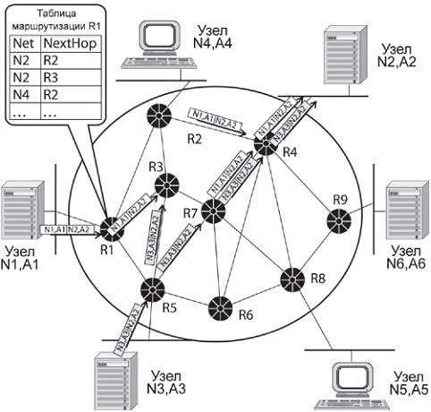 Примерами сетей, реализующих дейтаграммный механизм передачи, являются сети Ethernet, IP и IPX. С помощью виртуальных каналов передают данные сети X.25, frame relay и ATM. Сначала мы рассмотрим базовые принципы дейтаграммного подхода. Дейтаграммный способ передачи данных основан на том, что все передаваемые пакеты обрабатываются независимо друг от друга, пакет за пакетом. Принадлежность пакета к определенному потоку между двумя конечными узлами и двумя приложениями, работающими на этих узлах, никак не учитывается. Выбор следующего узла — например, коммутатора Ethernet или маршрутизатора IP/IPX — происходит только на основании адреса узла назначения, содержащегося в заголовке пакета. Решение о том, какому узлу передать пришедший пакет, принимается на основе таблицы, содержащей набор адресов назначения и адресную информацию, однозначно определяющую следующий (транзитный или конечный) узел. Такие таблицы имеют разные названия — например, для сетей Ethernet они обычно называются таблицей продвижения (forwarding table), а для сетевых протоколов, таких как IP и IPX, — таблицами маршрутизации (routing table). Далее для простоты будем пользоваться термином " таблица маршрутизации" в качестве обобщенного названия такого рода таблиц, используемых для дейтаграммной передачи на основании только адреса назначения конечного узла. В таблице маршрутизации для одного и того же адреса назначения может содержаться несколько записей, указывающих, соответственно, на различные адреса следующего маршрутизатора. Такой подход используется для повышения производительности и надежности сети. В примере на рис. 8 пакеты, поступающие в маршрутизатор R1 для узла назначения с адресом N2, А2, в целях баланса нагрузки распределяются между двумя следующими маршрутизаторами — R2 и R3, что снижает нагрузку на каждый из них, а значит, уменьшает очереди и ускоряет доставку. Некоторая " размытость" путей следования пакетов с одним и тем же адресом назначения через сеть является прямым следствием принципа независимой обработки каждого пакета, присущего дейтаграммным протоколам. Пакеты, следующие по одному и тому же адресу назначения, могут добираться до него разными путями и вследствие изменения состояния сети, например отказа промежуточных маршрутизаторов.