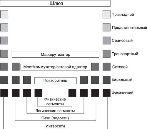 На рис. 11.9 показаны уровни модели OSI, на которых работают различные элементы сети. Компьютер с установленной на нем сетевой ОС взаимодействует с другим компьютером с помощью протоколов всех семи уровней. Это взаимодействие компьютеры осуществляют опосредованно, через различные коммуникационные устройства: концентраторы, модемы, мосты, коммутаторы, маршрутизаторы, мультиплексоры. В зависимости от типа коммуникационное устройство может работать либо только на физическом уровне (повторитель), либо на физическом и канальном (мост), либо на физическом, канальном и сетевом, иногда захватывая и транспортный уровень (маршрутизатор). На рис. 11.10 показано соответствие функций различных коммуникационных устройств уровням модели OSI.