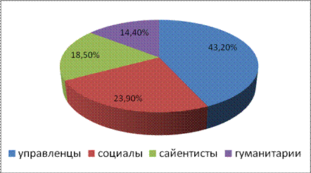 Основная цель эксперимента состояла в оценке стратегий поведения личности в конфликтном взаимодействии в зависимости от социтипа. Для этого с помощью методики …мы определили социотип каждого из участников эксперимента, а затем согласно соционическим клубам сформировали 4 подгруппы. К «Управленцам» относятся администратор, маршал, мастер, инспектор. «Сайентисты» - предприниматели, искатели, критики и аналитики. «Гуманитарии» это – наставники, советчики, лирики и гуманисты и «Социалы» это - энтузиасты, политики, посредники и хранители. Анализ распределения студентов по соционическим клубам показал, что наибольшая доля лиц приходится на управленцев – 43, 2% (55 человек), доля социалов составляет 23, 9% (30 человек), сайентистов – 18, 5% (24человека), остальные 14, 4% – гуманитарии (19 человек) (рисунок 1) Рисунок 1 Распределение студентов по соционическим клубам