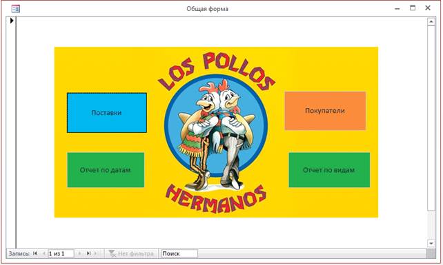Рис.7. Таблица поставка товара Формы Если запросы – это специальные средства для отбора и анализа данных, то формы – это средства для ввода данных. Смысл их тот же – предоставить пользователю средства для заполнения только тех полей, которые ему заполнять положено. Одновременно с этим в форме можно разместить специальные элементы управления (счетчики, раскрывающиеся списки, переключатели, флажки и прочее) для автоматизации ввода. Преимущества форм раскрываются особенно наглядно, когда происходит ввод данных с заполненных бланков. Для реализации интерфейса созданы формы. Главная кнопочная форма была создана в режиме конструктора. На главной форме мною были созданы 4 кнопки с переходами в таблицу «Поставки», в форму «Покупатели», и 2 отчета «Отчет по датам» и «Отчет по видам».
