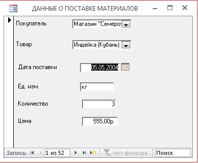 Форма «Данные о поставке материалов» была создана в режиме конструктора. В данной форме созданы поля в которых отображается дата поставки, количество и цена наименования товара которые заказывал магазин.